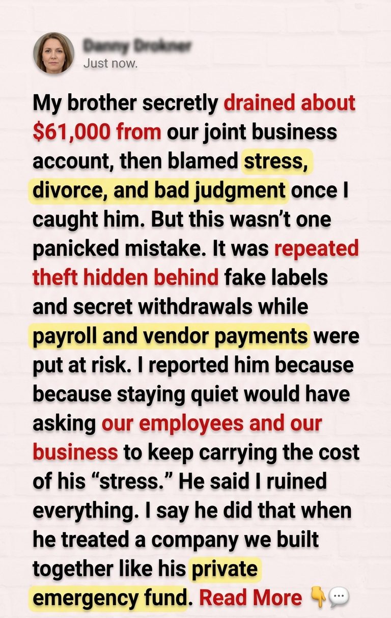 That’s what people kept misunderstanding. I reported him because once someone steals from a business account and blames stress, the business itself has no feelings to protect it. It only has records, legal obligations, and whichever owner is willing to stop pretending. If I had stayed quiet, I would have been asking every employee to trust a structure I knew had already been compromised by blood.