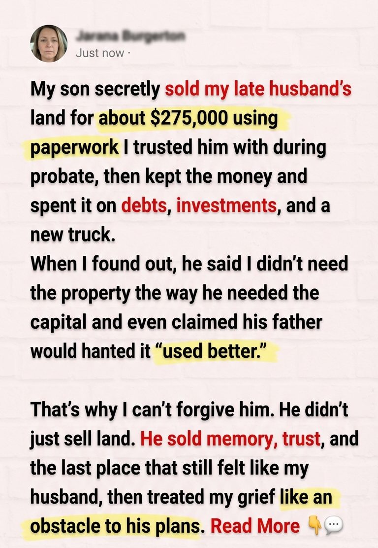 Some told me Ben meant well. Others said he was trying to help me by converting an “idle asset.” That phrase nearly made me scream. The land wasn’t idle. It was mine. It was memory. It was the only place I still felt my husband in a way the house no longer held cleanly. But even if it had been a barren field with no emotional weight at all, none of that changed the central fact: my son sold property he did not own and kept every dollar.