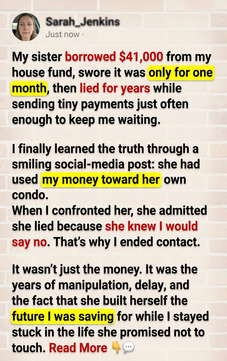 I ended contact because she didn’t just borrow my house fund and fail to repay it. She lied for years, bought herself the future I was saving toward, and then tried to make my outrage look petty once the truth caught up. Some betrayals aren’t repaired by repayment because the real loss isn’t only the money. It’s discovering that someone heard your trust as an opportunity.
