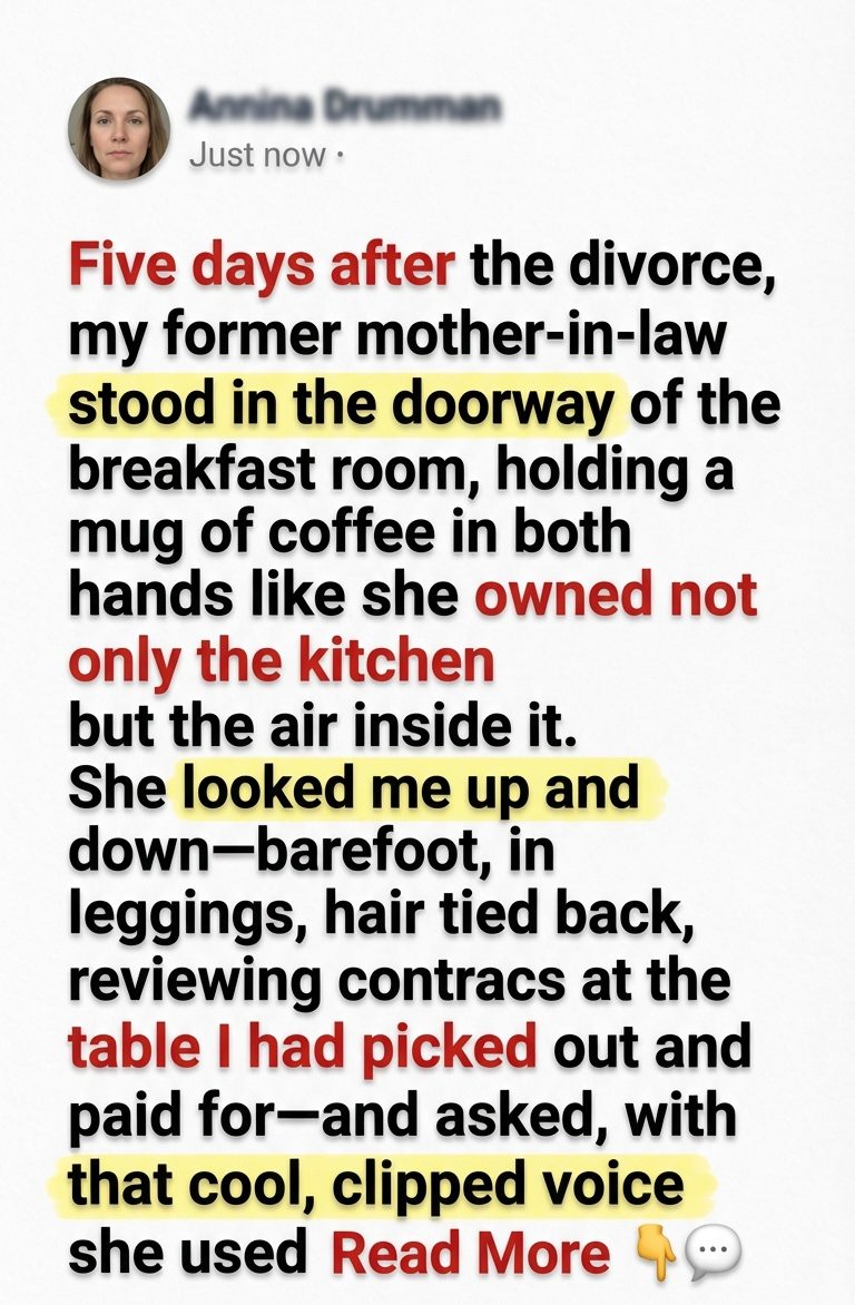 Five days after the divorce, my former mother-in-law stood in the doorway of the breakfast room, holding a mug of coffee in both hands as if she owned not just the kitchen but the air inside it.