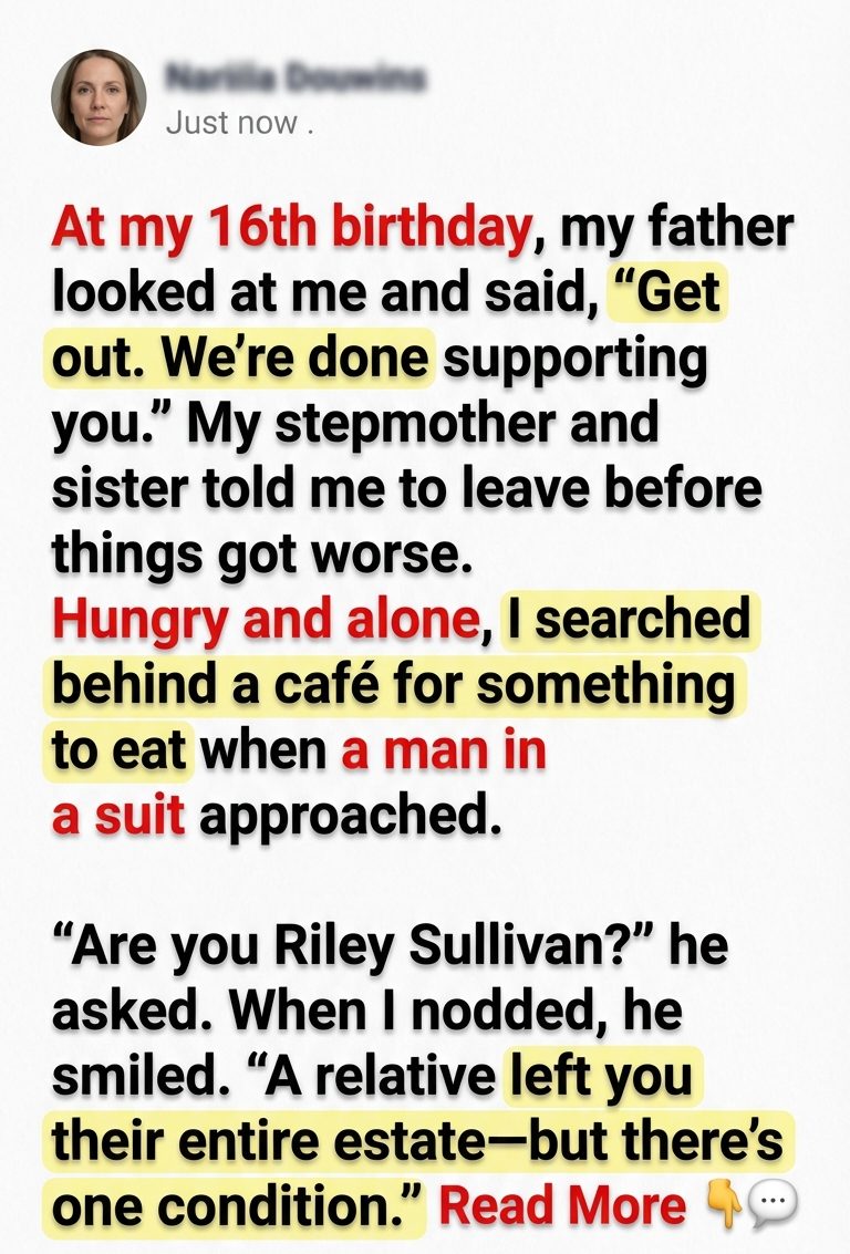 At My 16th Birthday, My Father Said, “Get Out. We’re Done Supporting You Anymore.” My Stepmother And Sister Said, “Go Before Things Get More Complicated At Home.” I Was Looking For Something To Eat Behind A Café When A Man In A Suit Approached. “Are You Riley Sullivan?” When I Nodded, He Smiled: “A Relative Left You Their Entire Estate — But There’s One Condition…”