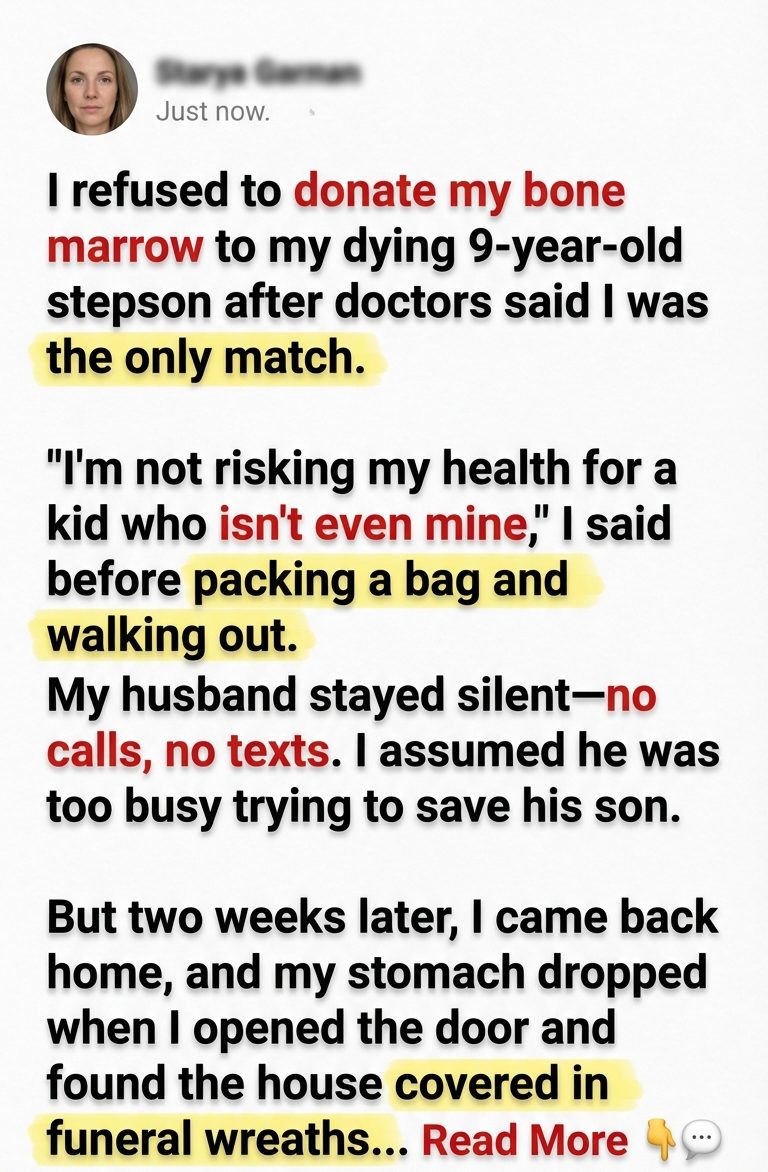 The words sounded cold even to my own ears, but at the time I convinced myself they were logical. Bone marrow donation wasn’t a small thing. There were risks, complications, recovery time. I told myself I barely knew the boy when I married his father. I hadn’t been there for his childhood, his first steps, his first day of school.