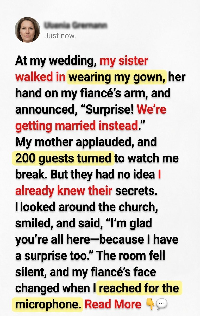 When I went into the bridal suite to get ready, my wedding dress was gone. Minutes later, the church doors opened, and my sister Lori walked down the aisle wearing it — with my fiancé Nick on her arm.