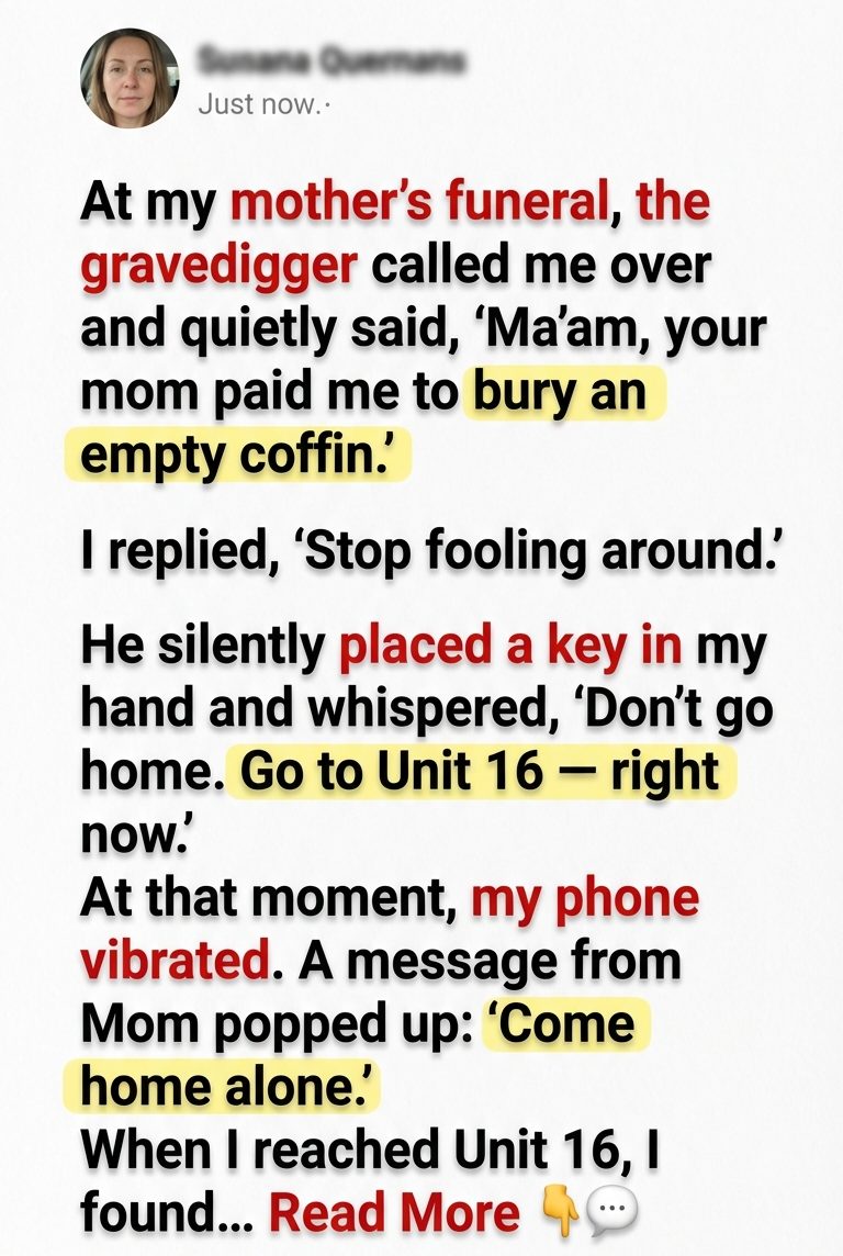 At my mother’s funeral, the gravedigger called me over and quietly said, ‘Ma’am, your mom paid me to bury an empty coffin.’ I replied, ‘Stop fooling around.’ He silently placed a key in my hand and whispered, ‘Don’t go home. Go to Unit 16 — right now.’ At that moment, my phone vibrated. A message from Mom popped up: ‘Come home alone.’ When I reached Unit 16, I found…