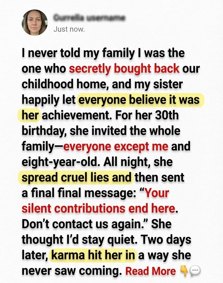 I never told my family I was the one who bought back our childhood home—my sister let everyone believe it was her achievement. For her 30th birthday, she invited the entire family… everyone except me and my eight-year-old. Throughout the party, she spread lies to turn them all against me. Her message was cru/el: “Your silent contributions end here. Don’t contact us again.” She thought I wouldn’t fight back. Two days later, karma hit her harder than she ever expected.