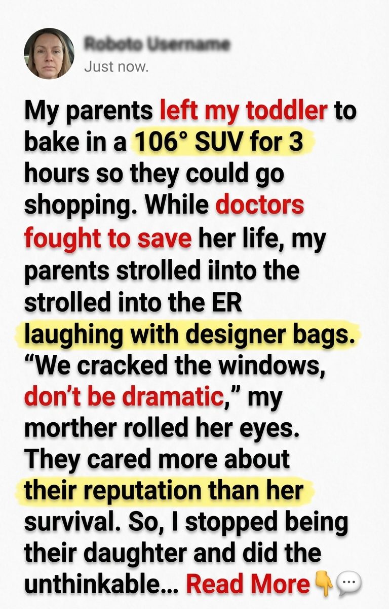 My parents left my toddler to bake in a 106° SUV for 3 hours so they could go shopping. While doctors fought to save her life, my parents strolled into the ER laughing with designer bags. “We cracked the windows, don’t be dramatic,” my mother rolled her eyes. They cared more about their reputation than her survival. So, I stopped being their daughter and did the unthinkable…