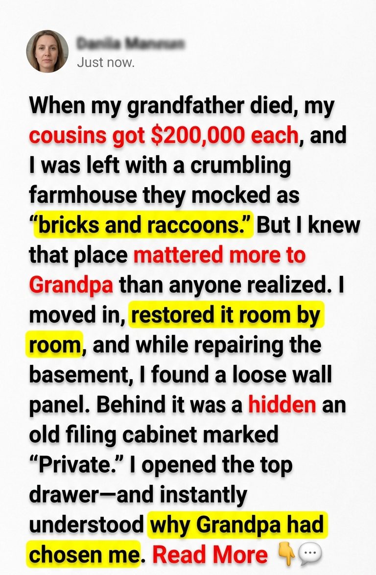 When my grandfather died, my cousins got $200,000 each, and I was left with a crumbling farmhouse they mocked as “bricks and raccoons.” But I knew that place mattered more to Grandpa than anyone realized. I moved in, restored it room by room, and while repairing the basement, I found a loose wall panel. Behind it was a hidden room and an old filing cabinet marked “Private.” I opened the top drawer—and instantly understood why Grandpa had chosen me.