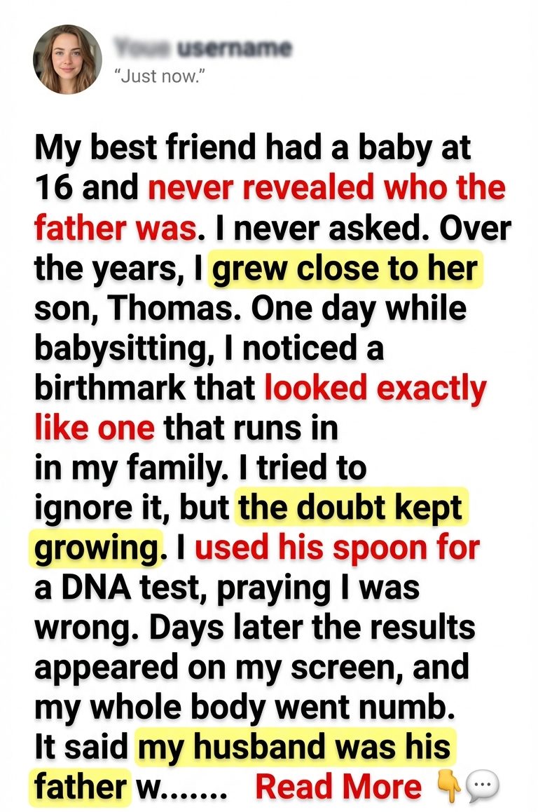 My best friend had a baby at 16 and never revealed who the father was. I never asked. Over the years, I grew close to her son, Thomas. One day while babysitting, I noticed a birthmark that looked exactly like one that runs in my family. I tried to ignore it, but the doubt kept growing. I used his spoon for a DNA test, praying I was wrong. Days later the results appeared on my screen, and my whole body went numb. It said my husband was his father.