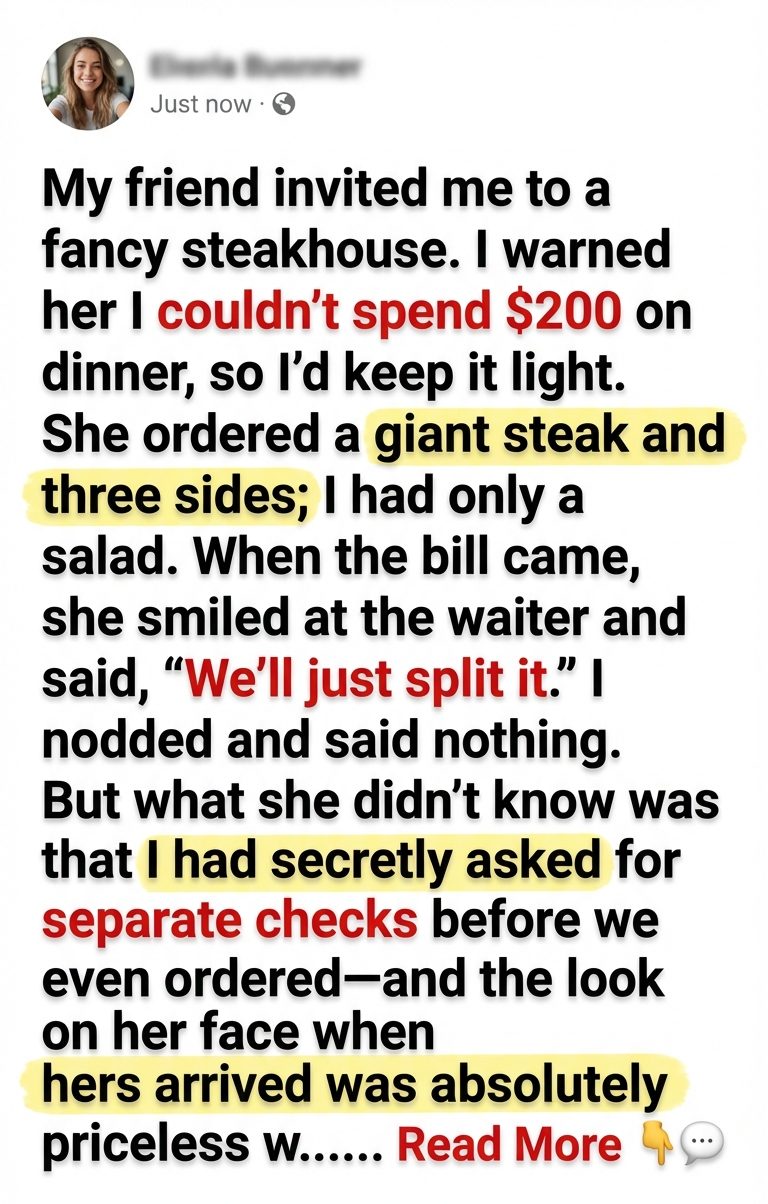 My friend invited me to a fancy steakhouse. I warned her I couldn’t spend $200 on dinner, so I’d keep it light. She ordered a giant steak and three sides; I had only a salad. When the bill came, she smiled at the waiter and said, “We’ll just split it.” I nodded and said nothing. But what she didn’t know was that I had secretly asked for separate checks before we even ordered—and the look on her face when hers arrived was absolutely priceless.