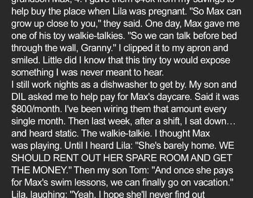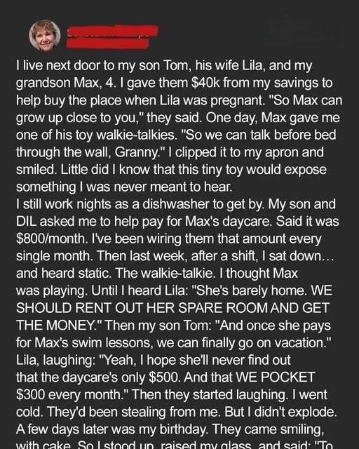 My grandson. Our secret chats. The walkie-talkie, once a symbol of pure, unconditional love, now lay on the floor, a cold, hard piece of plastic that had just demolished my entire world. I HAD TWO GRANDCHILDREN, BUT ONLY KNEW ONE. And the one I thought I knew, I knew under a lie. The one I didn’t know existed, was right there, all along. MY OWN CHILDREN. THEY LIED.