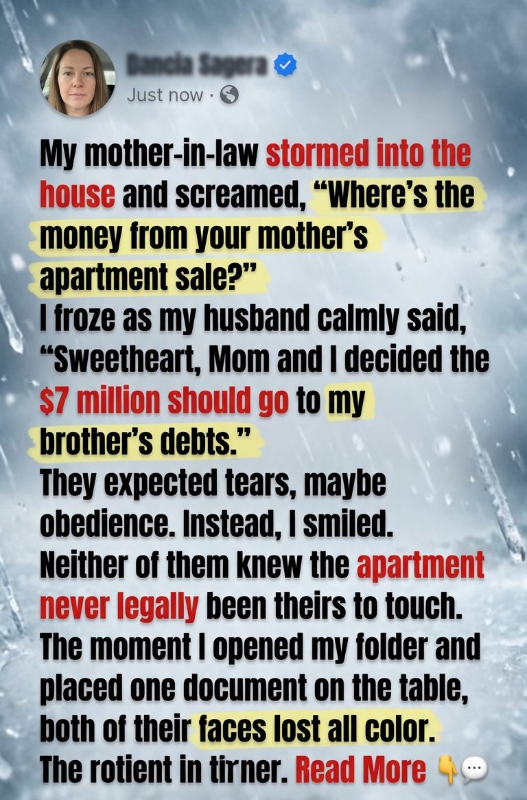 So yes, when my mother-in-law stormed into the house and demanded the money from my mother’s apartment sale, they expected tears. Maybe obedience. Maybe some wounded little argument they could overpower with numbers and guilt. Instead, I smiled. And the moment I opened my folder and placed that document on the table, both of their faces lost all color—because for the first time, they realized my mother had seen exactly what they were long before I did, and she had made sure they would never get away with it.