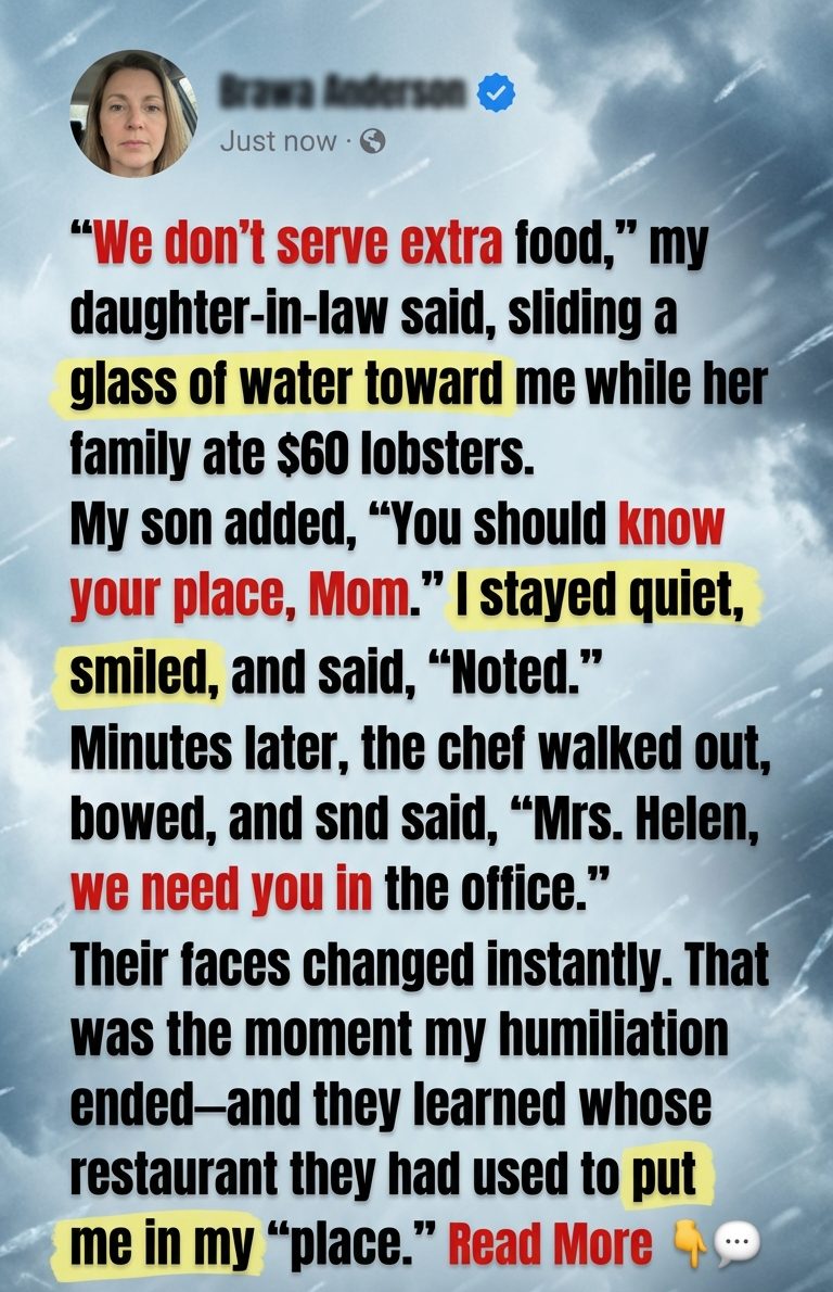 “We don’t serve extra food,” my daughter-in-law said, sliding a glass of water toward me while her family cracked open sixty-dollar lobsters and laughed like they were starring in a commercial for expensive happiness.