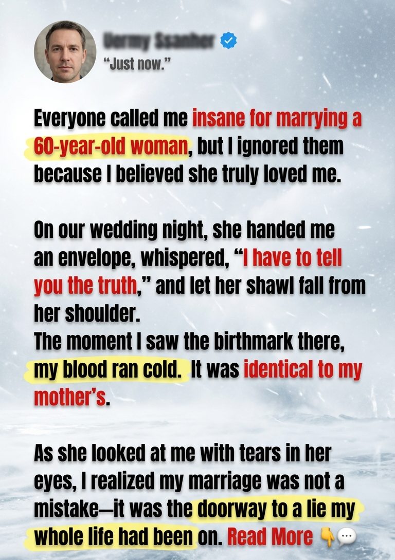 Some say she deceived me. Some say I lost my chance at a life of comfort out of pride. Some say my family was right all along. Let them. They are working with a story small enough for them to manage. Mine is larger now. Stranger. Sadder. More human. I didn’t marry a sixty-year-old woman because I wanted money. I married her because for the first time in my life I felt seen. And on our wedding night, I learned that even that feeling had roots reaching backward into a history I was never meant to know.