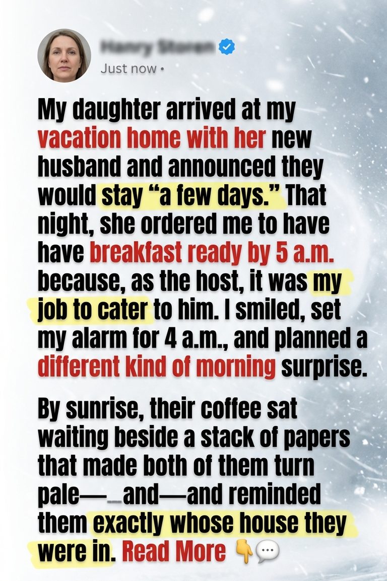 Twenty-four hours earlier, if someone had told me my own daughter would order me to wake before dawn and cook for the man she married three months ago, I might have felt heartbreak first. But sitting there watching them make themselves at home in my sanctuary, what I felt was clarity. Not rage. Not even surprise. Just the calm, precise understanding that they had finally overplayed whatever quiet little plan they’d been building. This wasn’t about breakfast. It was about hierarchy. About seeing whether I would slide into the role they had already written for me: aging mother, useful hostess, eventual dependent, temporary obstacle between them and whatever version of my life they imagined would one day become theirs.