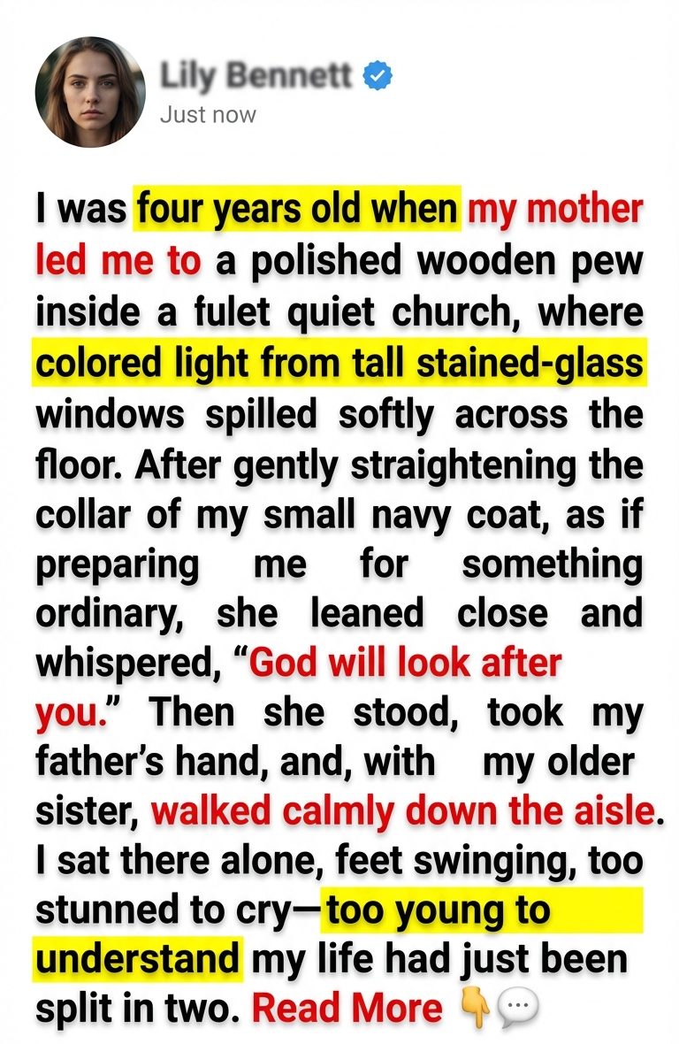 I was four years old when my mother led me to a polished wooden pew inside a quiet church, where colored light from tall stained-glass windows spilled softly across the floor. After gently straightening the collar of my small navy coat, as if preparing me for something ordinary, she leaned close and whispered, “Stay right here, sweetheart. God will look after you.” Then she stood, took my father’s hand, and, with my older sister, walked calmly down the aisle. I sat there alone, feet swinging, too stunned to cry—too young to understand my life had just been split in two.