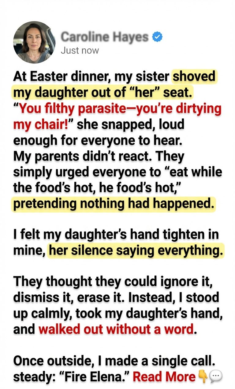 At Easter dinner, my sister shoved my daughter out of “her” seat. “You filthy parasite—you’re dirtying my chair!” she snapped, loud enough for everyone to hear. My parents didn’t react. They simply urged everyone to “eat while the food’s hot,” pretending nothing had happened. I felt my daughter’s hand tighten in mine, her silence saying everything. They thought they could ignore it, dismiss it, erase it. Instead, I stood up calmly, took my daughter’s hand, and walked out without a word. Once outside, I made a single call. My voice was steady: “Fire Elena.”