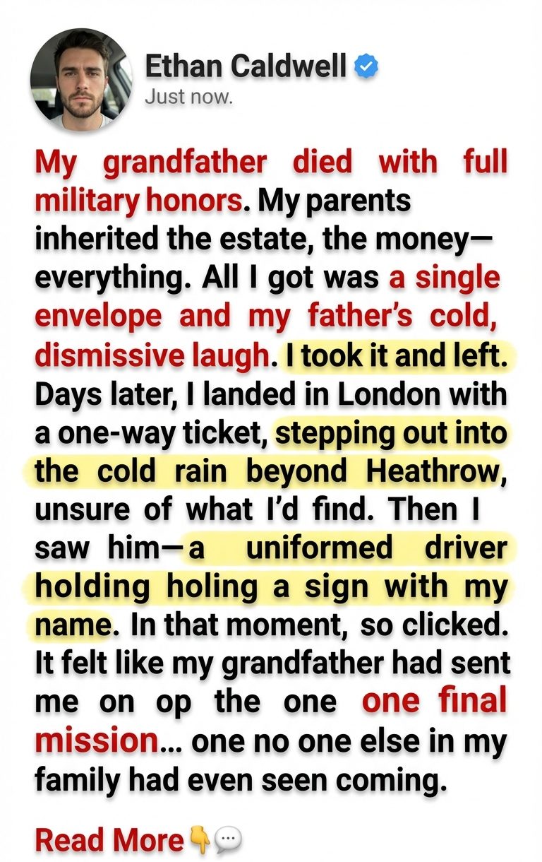 My grandfather died with full military honors. My parents inherited the estate, the money—everything. All I got was a single envelope and my father’s cold, dismissive laugh. I didn’t argue. I took it and left. Days later, I landed in London with a one-way ticket, stepping out into the cold rain beyond Heathrow, unsure of what I’d find. Then I saw him—a uniformed driver holding a sign with my name. In that moment, something clicked. It felt like my grandfather had sent me on one final mission… one no one else in my family had even seen coming. The sleek, black town car idling behind the stoic driver looked completely out of place for a young woman who had just been aggressively written out of a massive, multi-million dollar family inheritance.