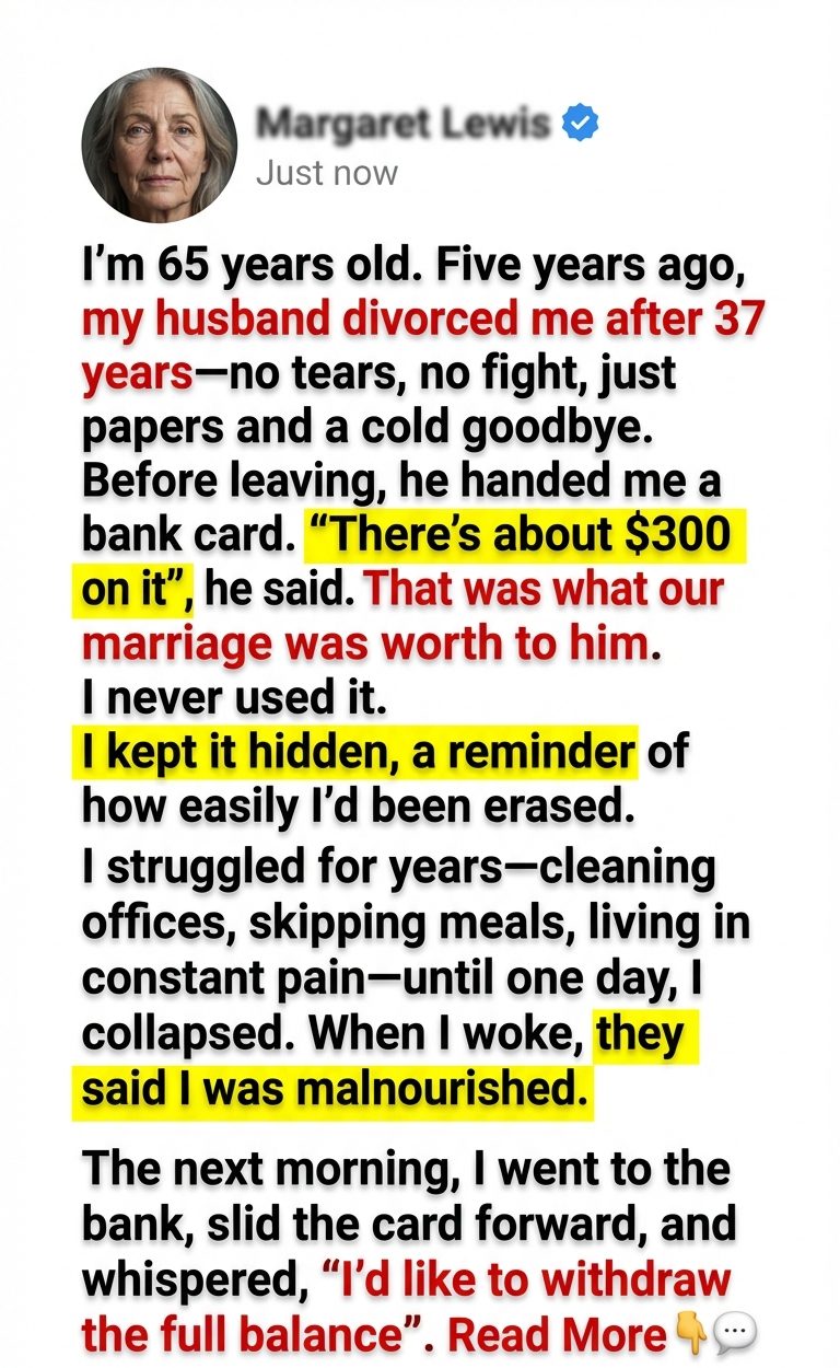 I’m 65 years old. Five years ago, my husband divorced me after 37 years—no tears, no fight, just papers and a cold goodbye. Before leaving, he handed me a bank card. “There’s about $300 on it,” he said. That was what our marriage was worth to him. I never used it. I kept it hidden, a reminder of how easily I’d been erased. I struggled for years—cleaning offices, skipping meals, living in constant pain—until one day, I collapsed. When I woke, they said I was malnourished. The next morning, I went to the bank, slid the card forward, and whispered, “I’d like to withdraw the full balance.”