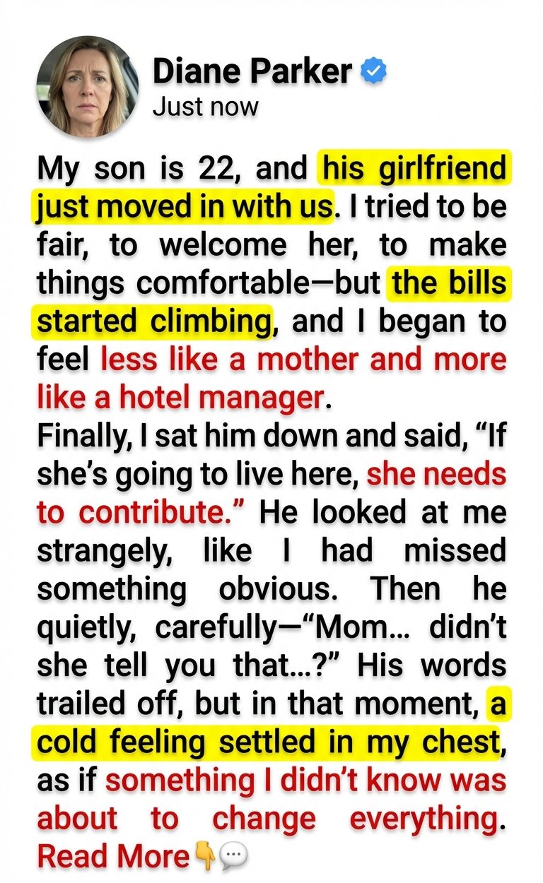 My son is 22, and his girlfriend just moved in with us. I tried to be fair, to welcome her, to make things comfortable—but the bills started climbing, and I began to feel less like a mother and more like a hotel manager. Finally, I sat him down and said, “If she’s going to live here, she needs to contribute.” He looked at me strangely, like I had missed something obvious. Then he spoke, quietly, carefully—“Mom… didn’t she tell you that…?” His words trailed off, but in that moment, a cold feeling settled in my chest, as if something I didn’t know was about to change everything. For the past four months, the dynamic in my usually peaceful, predictable suburban home had been steadily, undeniably shifting into something deeply uncomfortable and filled with unspoken resentment. I had spent decades meticulously maintaining this household, sacrificing my own personal luxuries to ensure that my son, Leo, always had a secure, warm, and loving environment to return to after his long days at the university. When he nervously asked if his girlfriend, Maya, could move into the empty guest bedroom because she was facing sudden financial difficulties with her previous landlord, my maternal instincts immediately overrode my logical, practical concerns. I completely opened my doors, prepared her favorite meals, and tried my absolute best to integrate her seamlessly into our established family routines. But instead of the joyful, blended household I had naively envisioned, I found myself drowning in a rising sea of exorbitant utility costs, completely depleted grocery pantries, and an exhausting, heavy silence that suffocated the hallways.