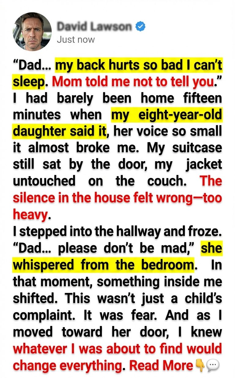 “Dad… my back hurts so bad I can’t sleep. Mom told me not to tell you.” I had barely been home fifteen minutes when my eight-year-old daughter said it, her voice so small it almost broke me. My suitcase still sat by the door, my jacket untouched on the couch. The silence in the house felt wrong—too heavy. I stepped into the hallway and froze. “Dad… please don’t be mad,” she whispered from the bedroom. In that moment, something inside me shifted. This wasn’t just a child’s complaint. It was fear. And as I moved toward her door, I knew whatever I was about to find would change everything.