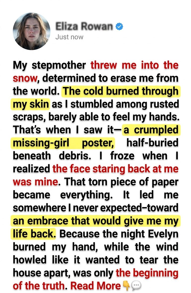 My stepmother threw me into the snow, determined to erase me from the world. The cold burned through my skin as I stumbled among rusted scraps, barely able to feel my hands. That’s when I saw it—a crumpled missing-girl poster, half-buried beneath debris. I froze when I realized the face staring back at me was mine. That torn piece of paper became everything. It led me somewhere I never expected—toward an embrace that would give me my life back. Because the night Evelyn burned my hand, while the wind howled like it wanted to tear the house apart, was only the beginning of the truth.