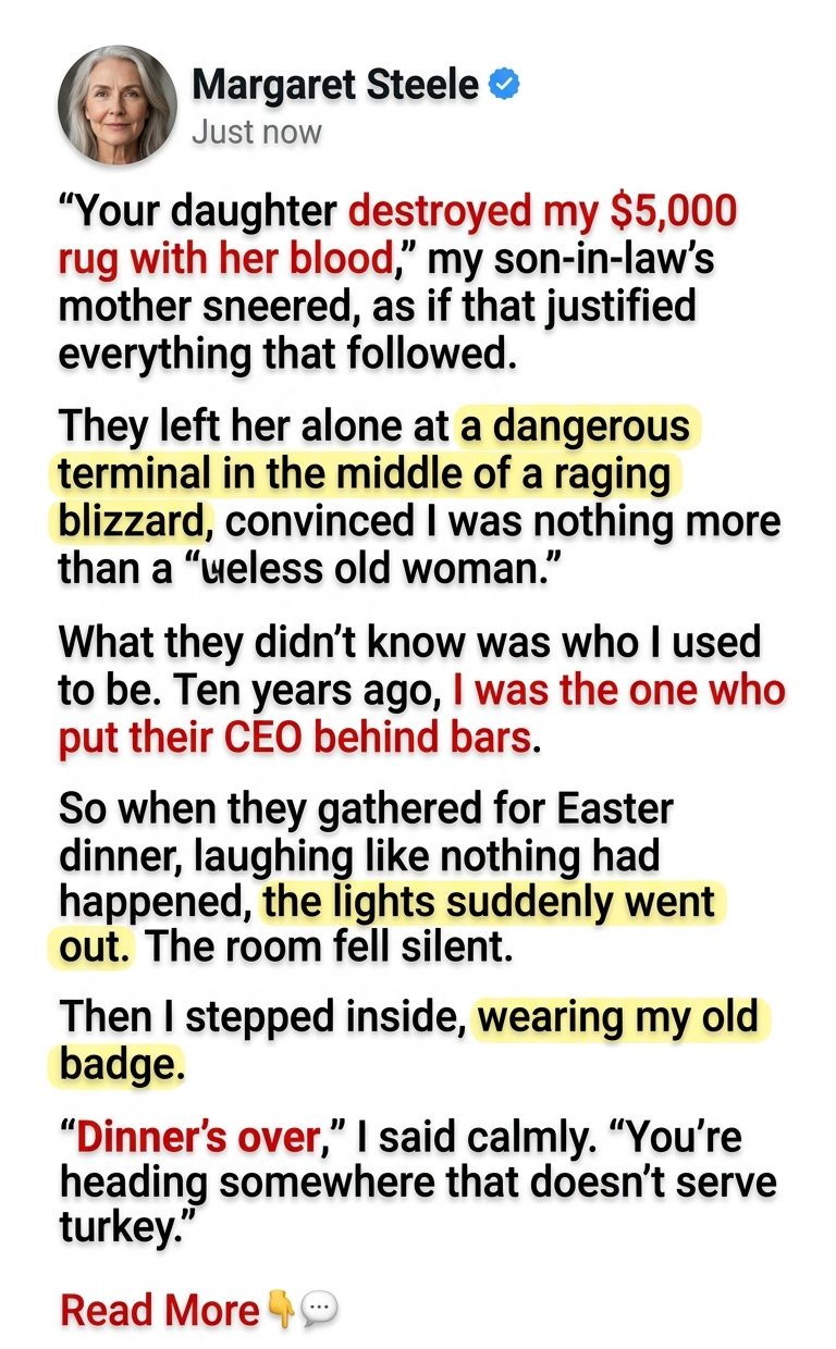 “Your daughter destroyed my $5,000 rug with her blood,” my son-in-law’s mother sneered, as if that justified everything that followed. They left her alone at a dangerous terminal in the middle of a raging blizzard, convinced I was nothing more than a “useless old woman.” What they didn’t know was who I used to be. Ten years ago, I was the one who put their CEO behind bars. So when they gathered for Easter dinner, laughing like nothing had happened, the lights suddenly went out. The room fell silent. Then I stepped inside, wearing my old badge. “Dinner’s over,” I said calmly. “You’re heading somewhere that doesn’t serve turkey.”