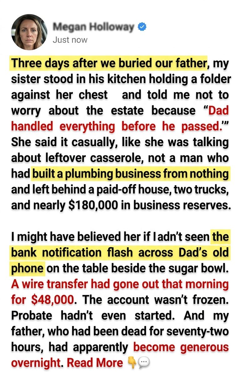 Three days after we buried our father, my sister stood in his kitchen holding a folder against her chest and told me not to worry about the estate because “Dad handled everything before he passed.” She said it casually, like she was talking about leftover casserole, not a man who had built a plumbing business from nothing and left behind a paid-off house, two trucks, and nearly $180,000 in business reserves. I might have believed her if I hadn’t seen the bank notification flash across Dad’s old phone on the table beside the sugar bowl. A wire transfer had gone out that morning for $48,000. The account wasn’t frozen. Probate hadn’t even started. And my father, who had been dead for seventy-two hours, had apparently become generous overnight.