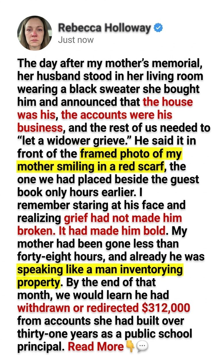 The day after my mother’s memorial, her husband stood in her living room wearing a black sweater she bought him and announced that the house was his, the accounts were his business, and the rest of us needed to “let a widower grieve.” He said it in front of the framed photo of my mother smiling in a red scarf, the one we had placed beside the guest book only hours earlier. I remember staring at his face and realizing grief had not made him broken. It had made him bold. My mother had been gone less than forty-eight hours, and already he was speaking like a man inventorying property. By the end of that month, we would learn he had withdrawn or redirected $312,000 from accounts she had built over thirty-one years as a public school principal.