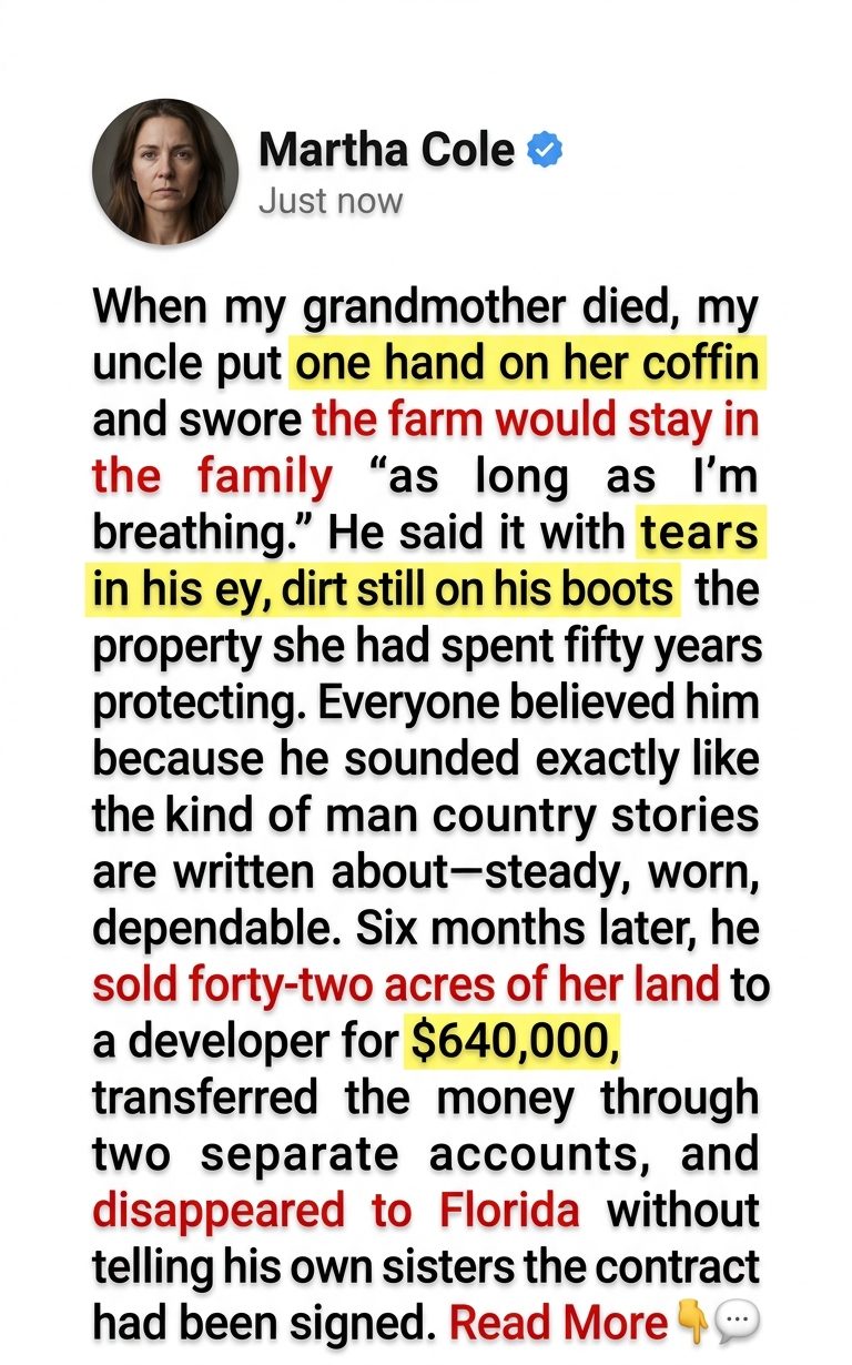 When my grandmother died, my uncle put one hand on her coffin and swore the farm would stay in the family “as long as I’m breathing.” He said it with tears in his eyes and dirt still on his boots from the property she had spent fifty years protecting. Everyone believed him because he sounded exactly like the kind of man country stories are written about—steady, worn, dependable. Six months later, he sold forty-two acres of her land to a developer for $640,000, transferred the money through two separate accounts, and disappeared to Florida without telling his own sisters the contract had been signed.