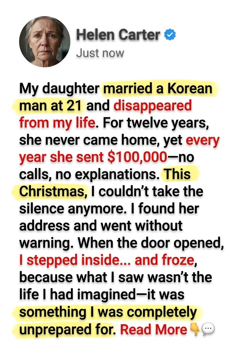 The first wire transfer arrived three months after my daughter disappeared from my life. It was for $100,000, sent from a Seoul bank I had never heard of, and the memo line contained only two words: For home. No letter. No phone call. No return address. Just money. At first I thought it was some grotesque mistake, the kind of banking error that would be corrected by noon. But the funds settled, the bank confirmed the transfer was intentional, and every year after that—always in early December, always the exact same amount—another $100,000 appeared in my account like a ritual performed by someone who refused to speak my name aloud.