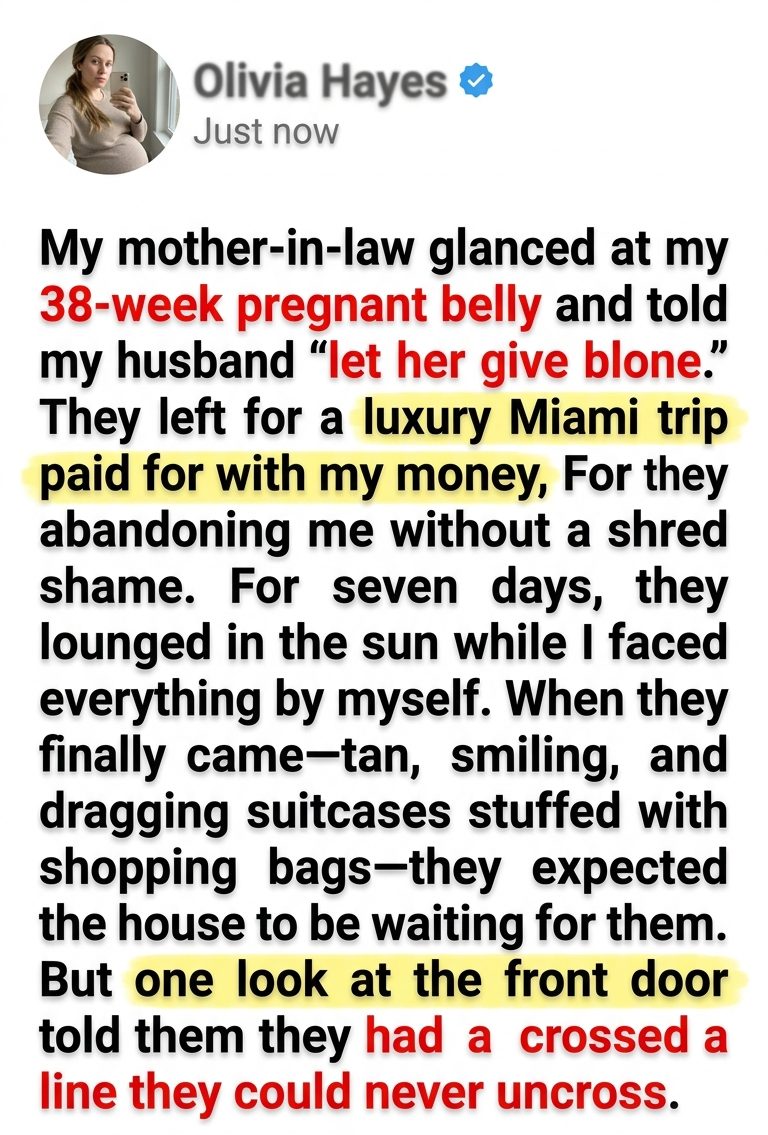 At thirty-eight weeks pregnant, swollen, exhausted, and moving through each day with the careful heaviness of someone carrying both life and fear at once, I stood in my own hallway and heard my mother-in-law tell my husband to “lock both deadbolts and let her give birth alone.” She did not whisper it. She did not veil it in passive-aggressive sweetness or concern. She said it plainly, with one manicured hand resting on the handle of her designer carry-on while her eyes flicked toward my stomach as if the baby inside me were a scheduling inconvenience. My husband did not laugh in disbelief or throw her out of the house or tell her that no mother worthy of the word would ever say such a thing to another woman. He adjusted his watch, glanced at the rideshare notification on his phone, and asked if I had remembered to forward the airport confirmation. Then the two of them left for a luxury Miami trip paid for with my money, abandoning me without embarrassment, without hesitation, and without even the courtesy of pretending this cruelty was anything but deliberate.