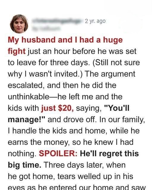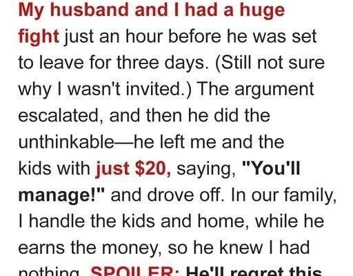 He left on a Friday morning. Three days. Three days to his friend’s lavish destination wedding, a celebration I couldn’t afford to attend, not with two small children at home and a single income barely stretching. He kissed the kids goodbye, packed his designer suit, and then, almost as an afterthought, placed a crumpled $20 bill on the kitchen counter.“That should hold you over,” he said, a dismissive wave of his hand already ushering him out the door. “I’ll be back Sunday evening.”