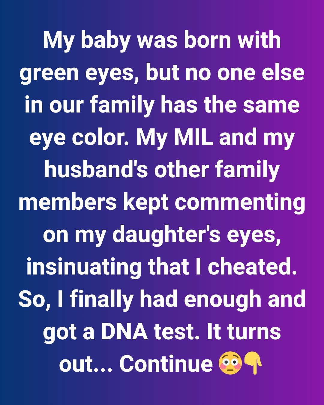 I, a 25-year-old female, gave birth to my daughter 2 months ago and despite my husband (28) telling me he knows I’d never cheat on him, I wanted to give our daughter a paternity test. The reason? She has green eyes and my husband and I both don’t have green eyes, my parents don’t either, and neither do my in-laws — no one in my family has them. My husband said it was probably some weird genetic thing, but I wanted the test for his peace of mind.