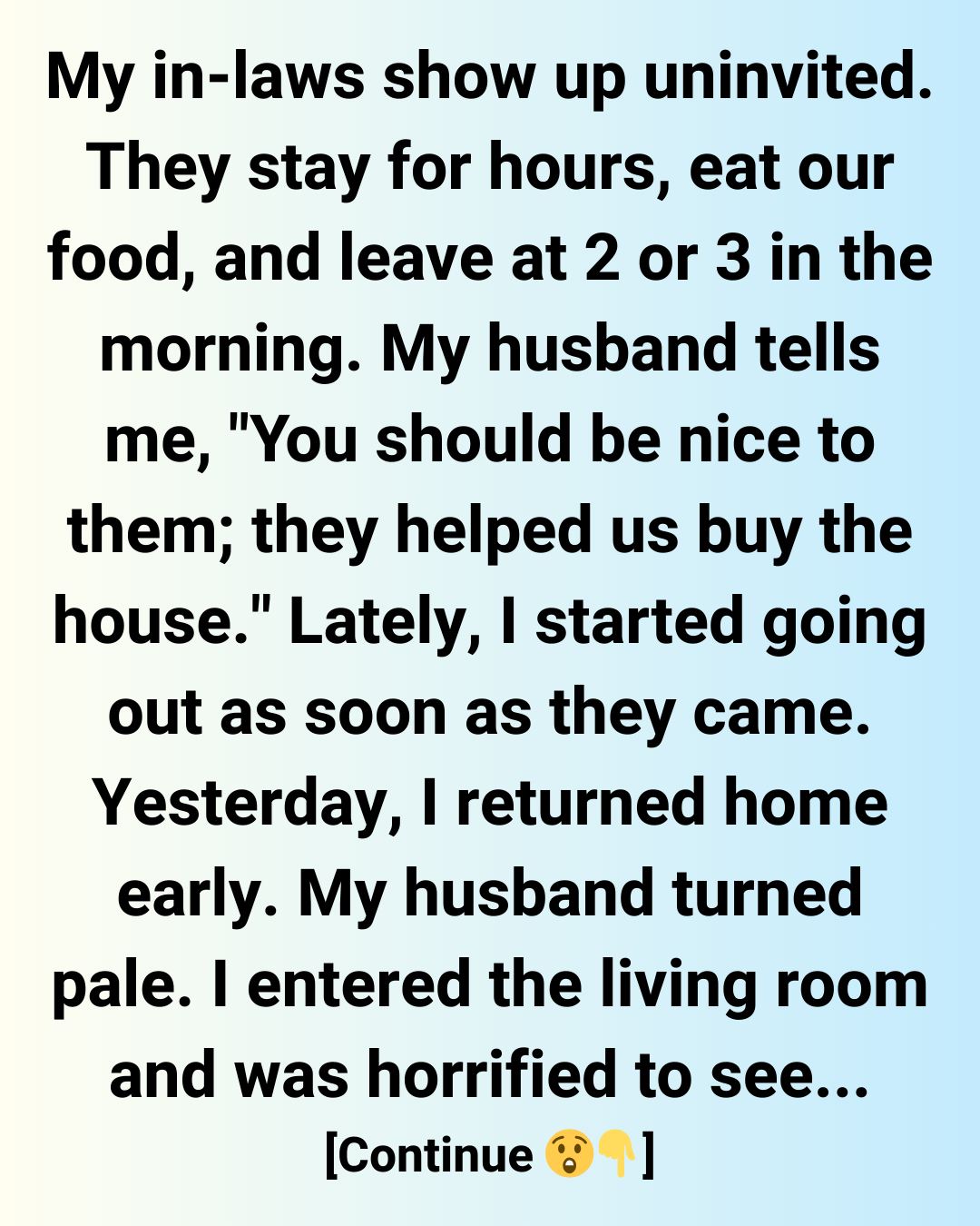 My in-laws have this habit of showing up uninvited. No call, no heads-up, nothing. They just knock on the door or, worse, use the spare key my husband gave them without asking me. And when they come, it’s never for a short visit. They hang out for hours, eat our food like it’s an all-you-can-eat buffet, and then leave around 2 or 3 in the morning.