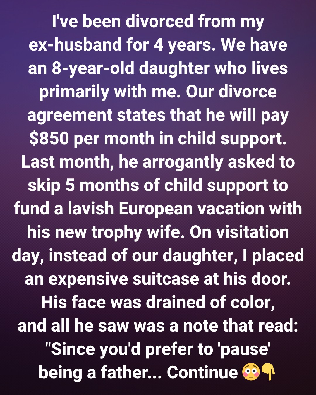 On his next visitation weekend, instead of dropping off Lily, I left a large suitcase at his front door. When he opened it, his face drained of color. On top sat a note that read: