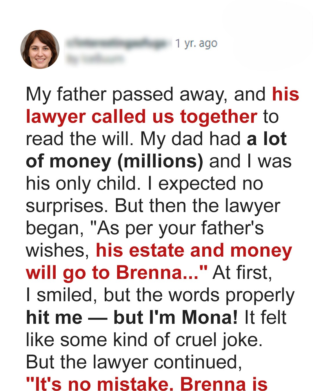 The lawyer nodded sympathetically. “Yes. And it’s no mistake. Brenna is the sole beneficiary.”