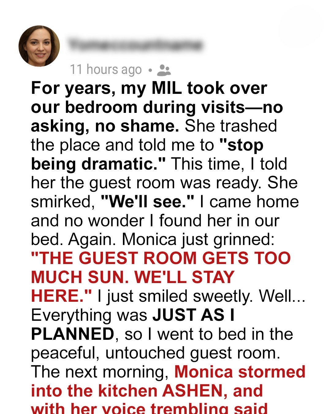 For years, the arrival of my mother-in-law, Monica, felt less like a family visit and more like a hostile takeover. Monica is a woman who believes that the world is a stage, and she is the only one with a speaking part. But her most egregious offense wasn’t her constant critiques of my cooking or her “helpful” suggestions on how to raise my children; it was her obsession with my bedroom.