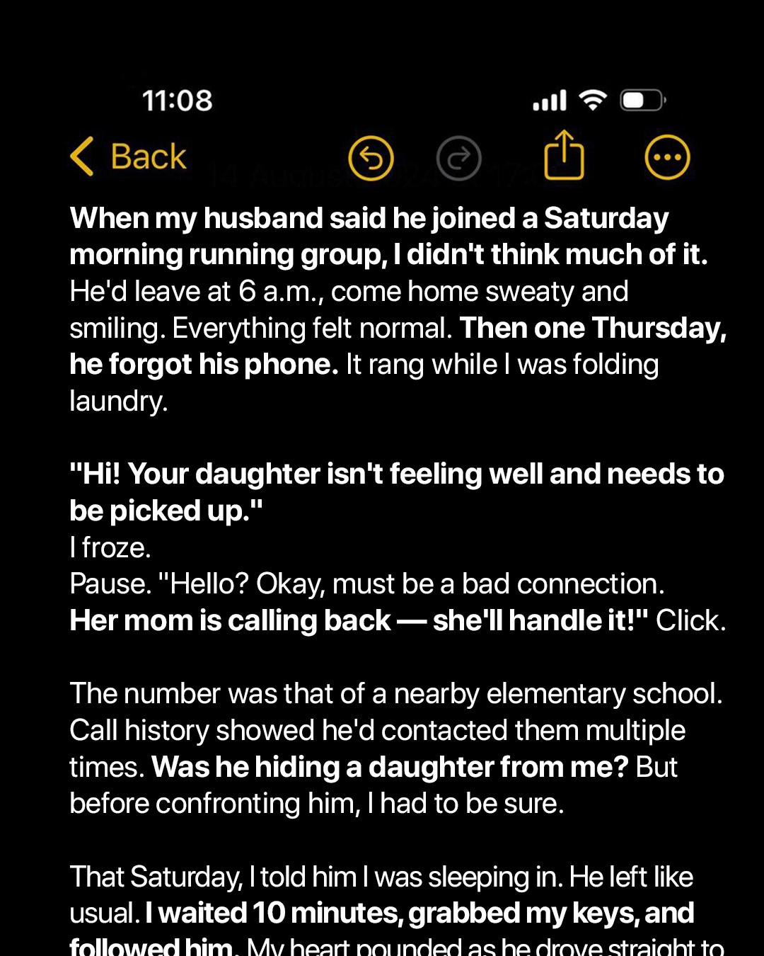 That night, I didn’t sleep. Every time Mark shifted in his sleep, I imagined him holding another woman, another child. I thought back to the “Saturday Morning Running Group” he’d joined six months ago. He’d leave the house at 6:00 AM sharp, dressed in expensive Lycra, and return around 9:30 AM, glowing with endorphins, his forehead damp with sweat. He’d talk about “hill repeats” and “interval training.” He’d even show me his Strava maps—beautiful GPS lines tracing paths through the local state park.