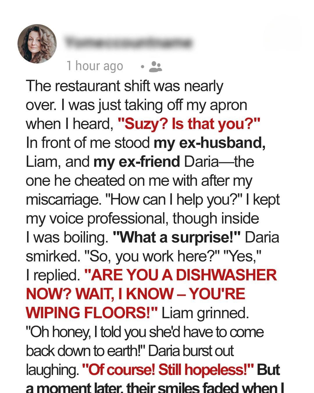 In front of me stood my ex-husband, Liam, and my ex-friend Daria—the one he cheated on me with after my miscarriage. “How can I help you?” I kept my voice professional, though inside I was boiling. “What a surprise!” Daria smirked. “So, you work here?” “Yes,” I replied. “ARE YOU A DISHWASHER NOW? WAIT, I KNOW—YOU’RE WIPING FLOORS!” Liam grinned. “Oh honey, I told you she’d have to come back down to earth!” Daria burst out laughing. “Of course! Still hopeless!”