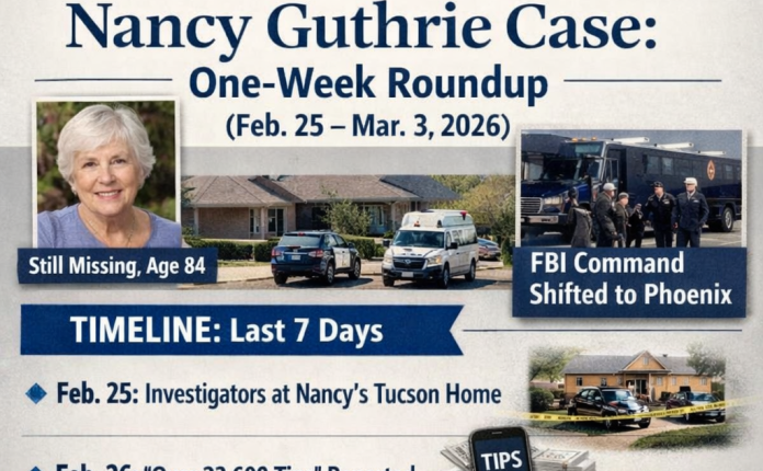 NEWSNancy Guthrie Case Timeline: FBI Shifts Command to Phoenix as Tip Surge Grows (Feb. 25–Mar. 1) March 1, 2026 - by Reading Times … Nancy Guthrie Case Timeline: FBI Shifts Command to Phoenix as Tip Surge Grows (Feb. 25–Mar. 1) Read More